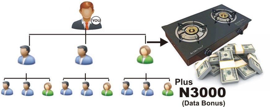 - Apart from the Gas Burner, the company also has a Seven (7) Level referral bonus of 6.7% to infinity generated for you. This is the instant Cash you earn as referral bonus from all the registration fee of the people you referred or introduced to the business from the first person to infinity. How is this possible? Yes it is!. When you register, you are been given a Code or ID Number in which you use to identify yourself and make all your purchases. This same number will be used alongside with the number of the person you refer. With this technology, You continue to collect 6.7% from all registration fee of the people you refer. Currently Registration is N7,500, so you get a rounded of N500 from each registration automatically sent into your online wallet and thereafter transferred to your Bank account by month end. So the more new members that join the business through you, the more money the company pays into your bank account on monthly basis. It’s just an appreciation bonus to say thank you.